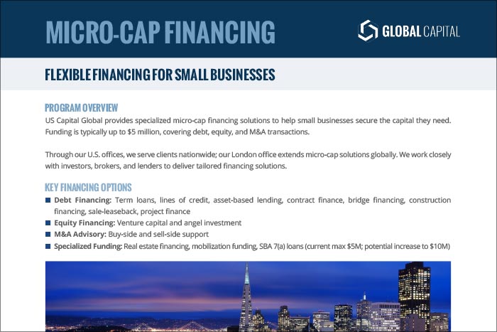 US Capital Global provides specialized micro-cap financing solutions to help small businesses secure the capital they need. Funding is typically up to $5 million, covering debt, equity, and M&A transactions.